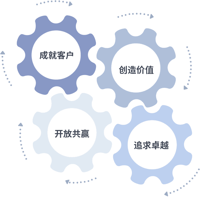 成就客户是一切决策的出发点,,,创造价值是衡量所有工作的标准,,追求卓越是我们做事做人的态度,,开放共赢是我们的格局也是最终的结果。。价值观的齿轮环环相扣,,,推动着组织里的每个人不断向前。。